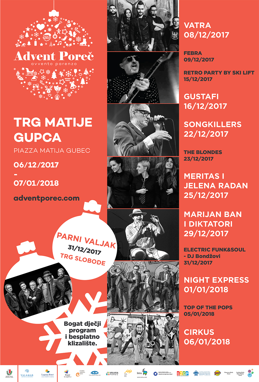- Doček Nove godine u Poreču jedan je od najpopularnijih u Hrvatskoj, pa s ponosom mogu najaviti da će se ove godine u našem gradu održati čak četiri dočeka. Brojne okupljene će na tradicionalnom dočeku na Trgu slobode zabavljati jedan od najvećih hrvatskih bendova svih vremena – Parni valjak. Za one željene nešto drugačijeg tipa dočeka, na Trgu Matije Gupca bit će organiziran electro-funk doček s DJ Stankom Bondžom. Na istom će se mjestu, na Silvestrovo u podne održati doček za naše najmlađe uz glazbu, animaciju i dječji vatromet. A kako bismo u velikom stilu zatvorili proslave ulaska u novu 2018. godinu, 1. siječnja organizirali smo i reprizu dočeka s Night Expressom na Trgu Matije Gupca, najavio je gradonačelnik.