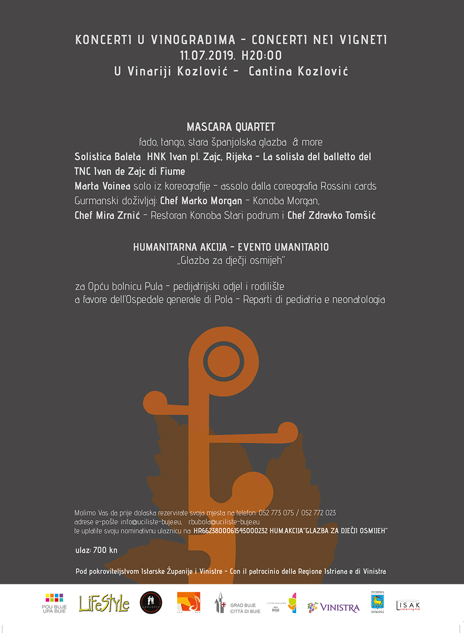 Pučko otvoreno učilište Buje – Università popolare aperta di Buie u suradnji s agencijom za kulturno-umjetničke djelatnosti Lifestyle d.o.o. i Vinarijom Kozlović, uz podršku Grada Buje – Città di Buie, Turističke zajednice grada Buja – ET Buie pod pokroviteljstvom Istarske Županije i Vinistre, organizira 11. srpnja 2019. u 20:00 sati u Vinariji Kozlović humanitarni koncert „GLAZBA ZA DJEČJI OSMIJEH“ na kojem će nastupiti poznati slovenski glazbeni sastav Mascara Quartet te solistica baleta HNK „Ivana pl. Zajca“ iz Rijeke Marta Voinea, uz eno-gastronomsku ponudu Vinarije Kozlović i renomiranih chefova: Chef Marko Morgan – Konoba Morgan, Chef Mira Zrnić – Restoran Konoba “Stari podrum i Chef Zdravko Tomšić.