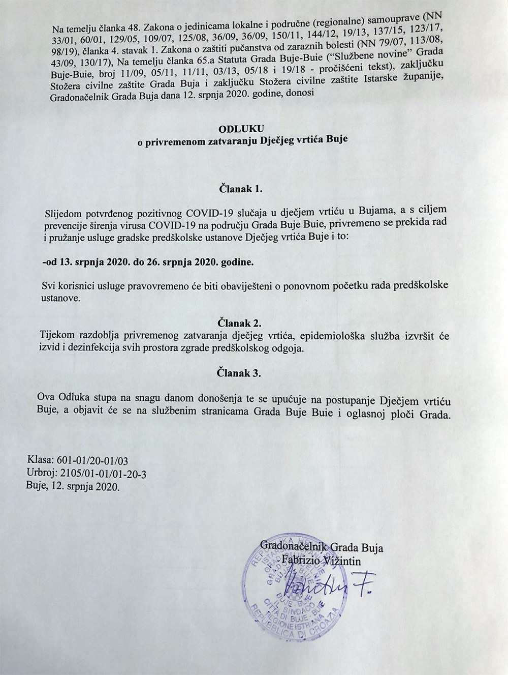 12.07.2020.Danas su pristigli nalazi za djelatnicu bujskog dječjeg vrtića iz kojih je proizašlo da ista je oboljela od koronavirusa. Na svu sreću nije riječ o djelatnici koja je bila u direktnom kontaktu s djecom i s drugim djelatnicama. Ono što također tješi je da su se unutar vrtića strogo provodile mjere predostrožnosti. Nosile su se maske, dezinficirale su se ruke, izbjegavala su se druženja djelatnika i sl. Svih mjera se pridržavala i navedena djelatnica za vrijeme boravka u vrtiću, koja na poslu nije bila iz opravdanih razloga od prethodne srijede. No, kako bi se izbjegle sve mogućnosti dodatne zaraze i kako bi se doznalo da li se zaraza proširila i na druge osobe, angažirana je epidemiološka služba koja će provjeravati kontakte i provoditi svu ostalu potrebnu proceduru. Kako bi se dodatno smanjili rizici, vrtić će biti zatvoren od 13.-26. srpnja. Ujedno, sljedećeg utorka će se provesti dezinfekcija svih prostorija unutar zgrade. U nastavku možete pročitati odluku o privremenom zatvaranju.