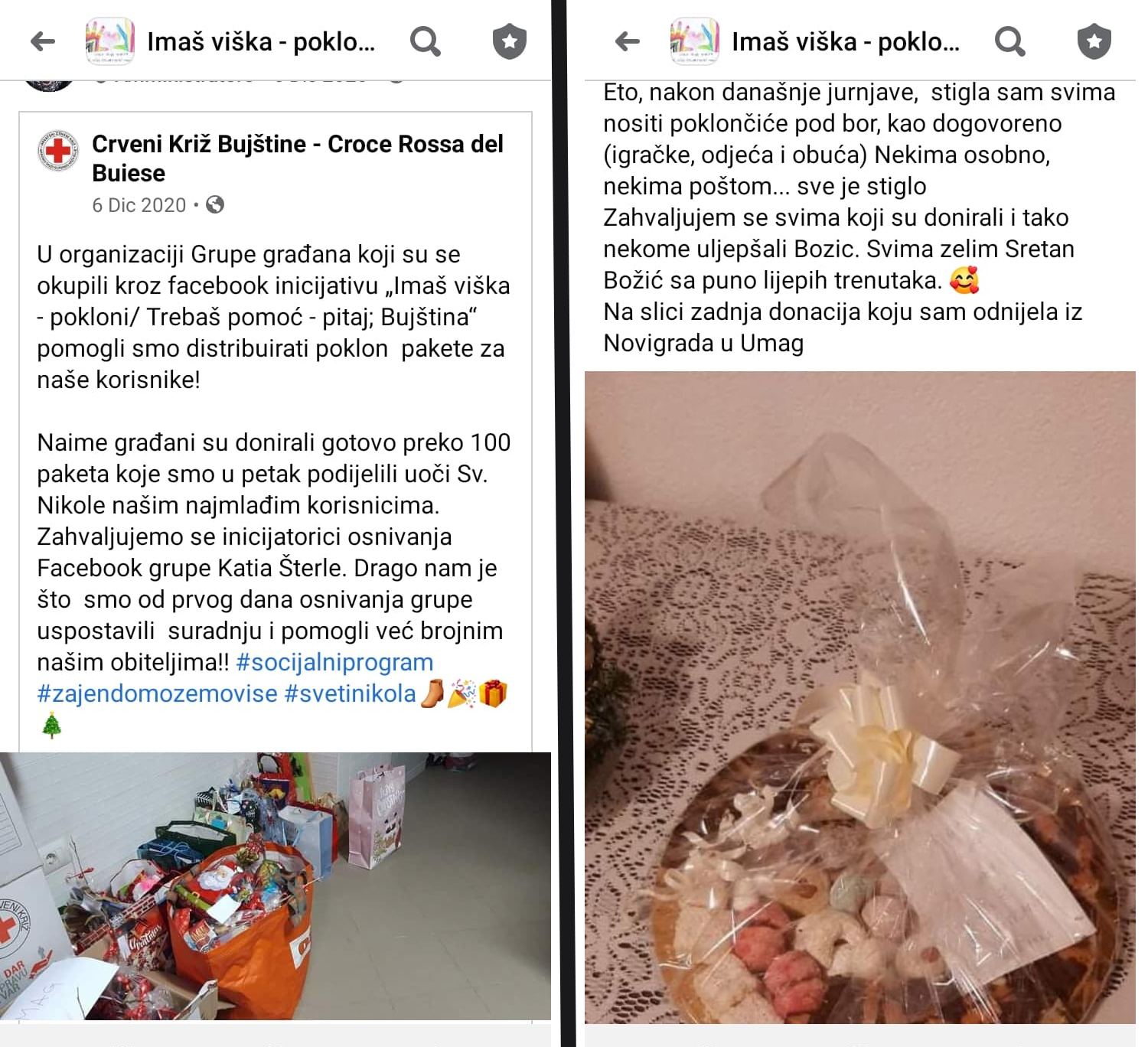 31.01.2021.Prošla, 2020.g. donijela je području Bujštine više pozitivih akcija. Među njiima, bila je i ona u 10-om mjesecu, kada je gđa Katia Šterle kreirala facebooku grupu humanitarnog karaktera pod imenom Imaš viška-pokloni/ Trebaš pomoć-pitaj; Bujština. Danas ista ima gotovo 2500 članova i aktivno se bavi pomaganjem potrebitih ljudi našeg kraja, ali i šire.