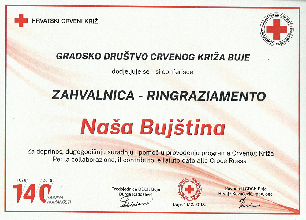 Jučer, 14.12.2018. na skupštini Crvenog Križa Buje povodom 140.godišnjice osnutka Crvenog Križa Hrvatske i 65. obljetnice akcije darivanja krvi, uručena nam je zahvalnica za doprinos, dugogodišnju suradnju i pomoć u provođenju programa Crvenog Križa, u području informiranja javnosti o njihovom radu i promoviranju humanitarnih akcija u njihovoj ingerenciji.