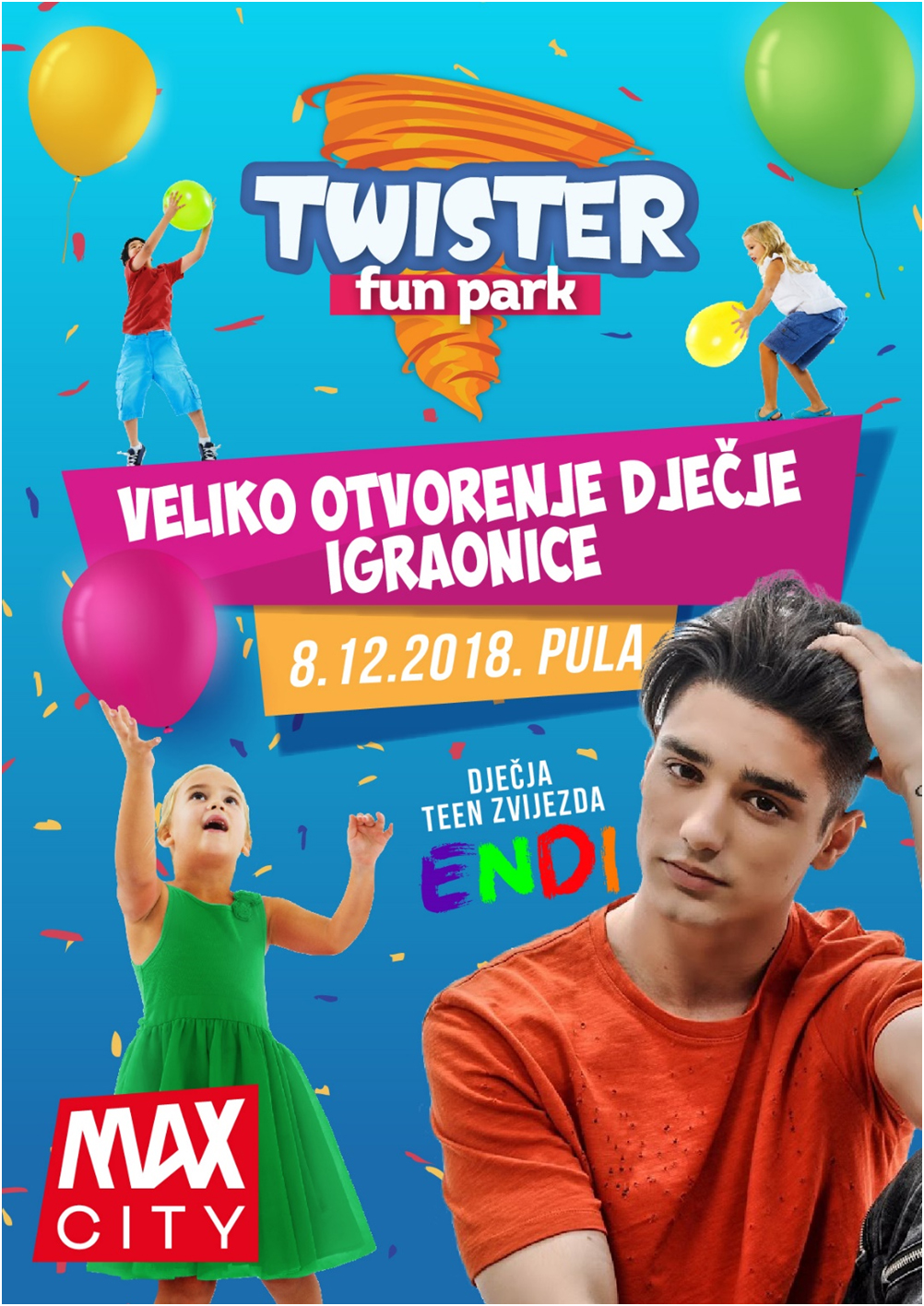 Najveći hrvatski lanac dječjih igraonica pod brandom TWISTER FUN PARK u subotu 08.prosinca 2018. svečano otvara šestu igraonicu u Hrvatskoj u sklopu trgovačkog centra Max City u Puli.
