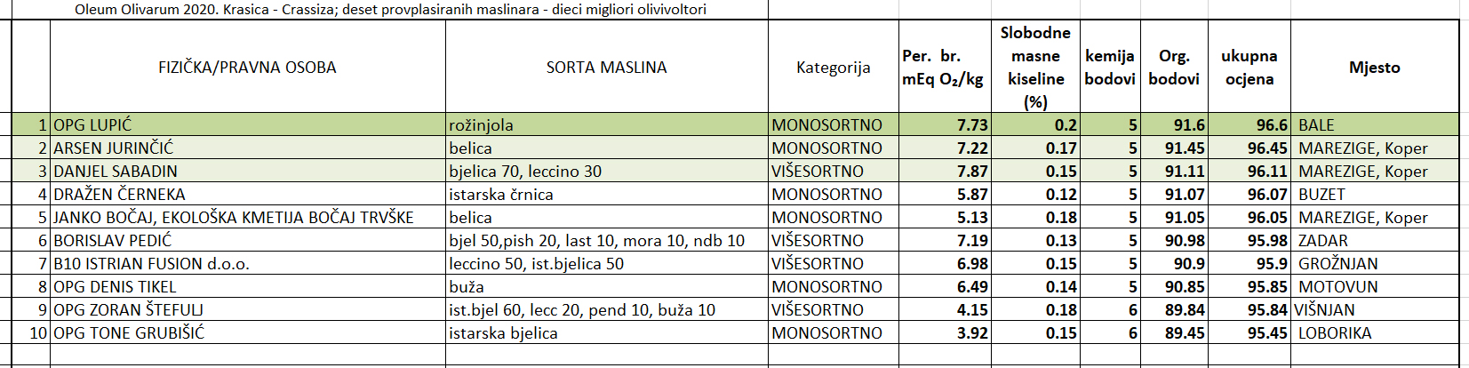 Šampion ovogodišnje manifestacije „Oleum Olivarum“ je OPG Lupić iz Bala sa ukupno 96,6 osvojenih bodova.