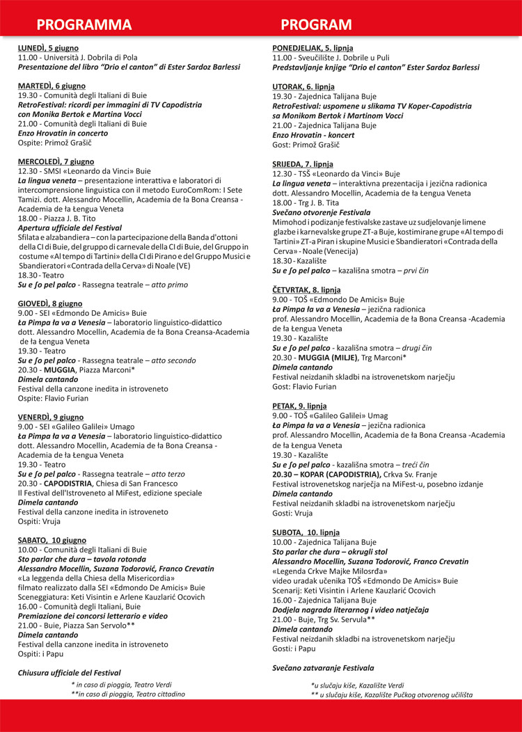 Cijeli program započinje u Puli 05.lipnja te se nastavlja u Bujama 06. lipnja. Nakon prva dva dana koji predstavljaju svojevrsni uvod, uslijedi će službeno Svečano otvorenje festivala 07.lipnja u Bujama. Slijedećeg dana, 08.lipnja nakon jutarnjeg programa u Bujama, Festival seli u Milje (Muggia), da bi 09. lipnja došao u Umag i Kopar.