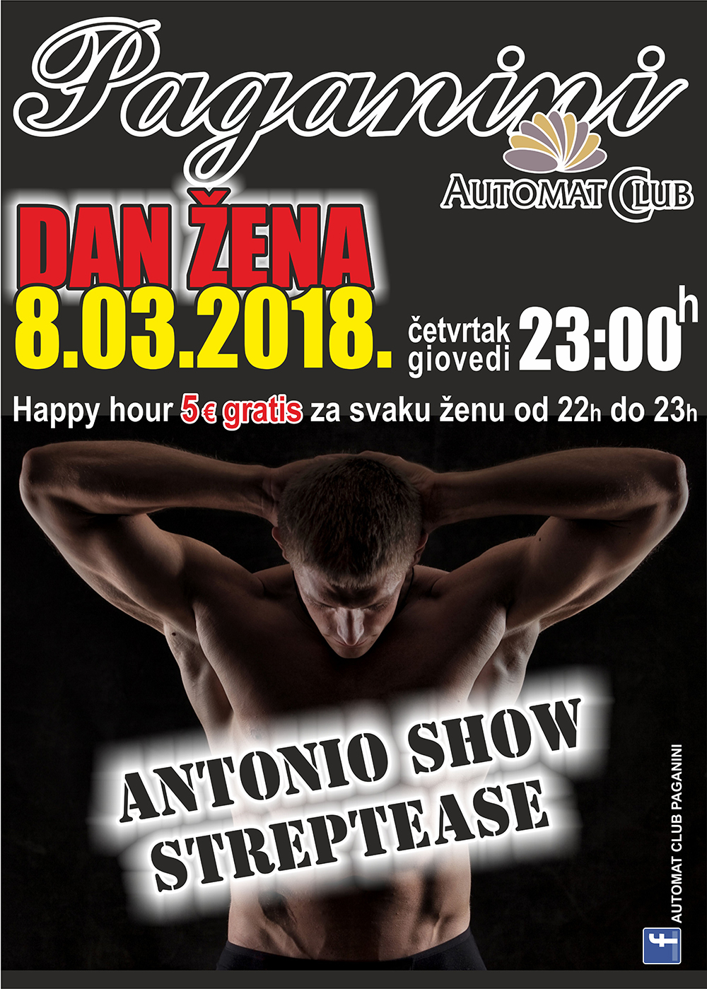 U 23 sata uslijediti će Antonio show, koji će uz vrući striptiz, raspametiti sve prisutne i prirediti spektal o kojemu su mnoge, do sada, mogle samo sanjati.