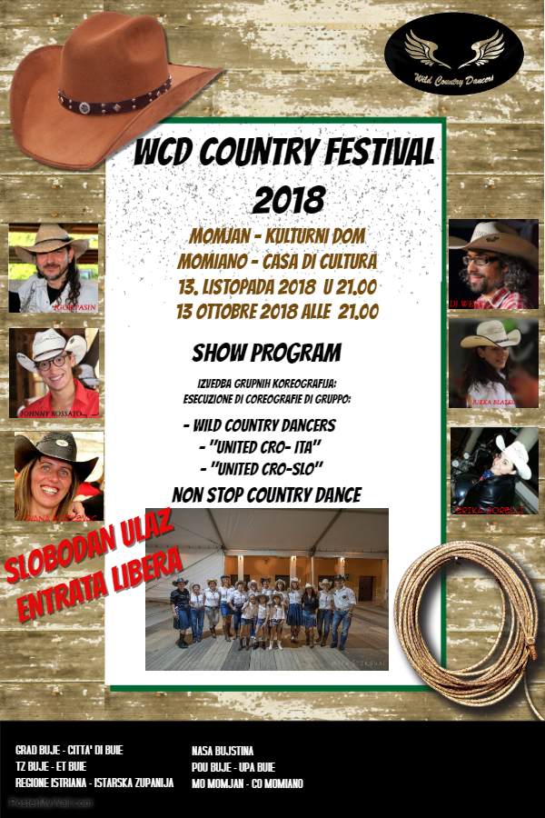 WCD Country Festival je prvi festival takvoga tipa organiziran u Hrvatskoj, i to u našoj istarskoj regiji, u Momjanu, na području Bujštine. Program festivala će se odvijati tijekom 13. listopada 2018., s početkom u ranim popodnevnim satima, kada će se odvijati plesne radionice za uzvanike koji već plešu country line dance. Tijekom dana ugošćeni koreografi iz Italije i Slovenije, educirat će plesače s novim koreografijama kreiranih za tu prigodu.