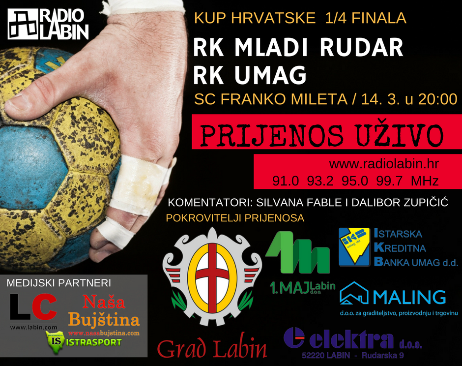 Veliki nas istarski rukometni derbi očekuje u srijedu, 14.ožujka. Četvrtfinalna utakmica Kupa Hrvatske u kojoj se sastaju vodeća momčad Prve Hrvatske rukometne lige Jug „Mladi Rudar“ i premijer ligaš Rukometni klub Umag. Kovare u njihovom Sportskom centru Franko Mileta očekuje još jedan povijesni susret, jedan od najvažnijih ove sezone. Pobjeda ih vodi u tako željeni Final Four, među četiri najbolje rukometne momčadi u Kupu. Rukometaši Umaga su inače jedina istarska rukometna momčad koju trener Mladog Rudara Ilija Lovrinović nije pobijedio. Neka u srijedu i to postane povijest. Ako te velike labinske rukometne večeri ne stignete u Sportski centar Franko Mileta, koji će zasigurno biti premali da primi sve ljubitelje rukometa, sve navijače, budite uz program Radio Labina. U izravnom prijenosu od 19.45 sati prenijet ćemo vam sve ono što se na parketu bude događalo i nadamo se na kraju utakmice slaviti zajedno s pobjednicima ovog dugoočekivanog derbia. Utakmica počinje u 20 sati. Podsjetimo da je Mladi Rudar četvrtfinale izborio pobjedom u Osijeku, a Umag pobjedom protiv Rukometnog kluba Ribola Kaštela.