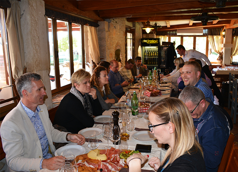 Nakon radnog djela uslijedilo je druženje uz specijalitete koje je pripremilo i serviralo vrhunsko osoblje konobe Rustica, a da bi ugođaj bio još bolji uz svako jelo su prezentirana i servirana različita vrhunska vina vinarije Degrassi.