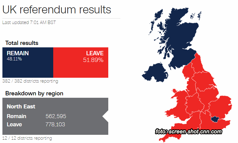 Prebrojani su glasovi u 382 izborne jedinice. Za izlazak je glasalo 51,89%, a za ostanak 48.11% posto glasača.