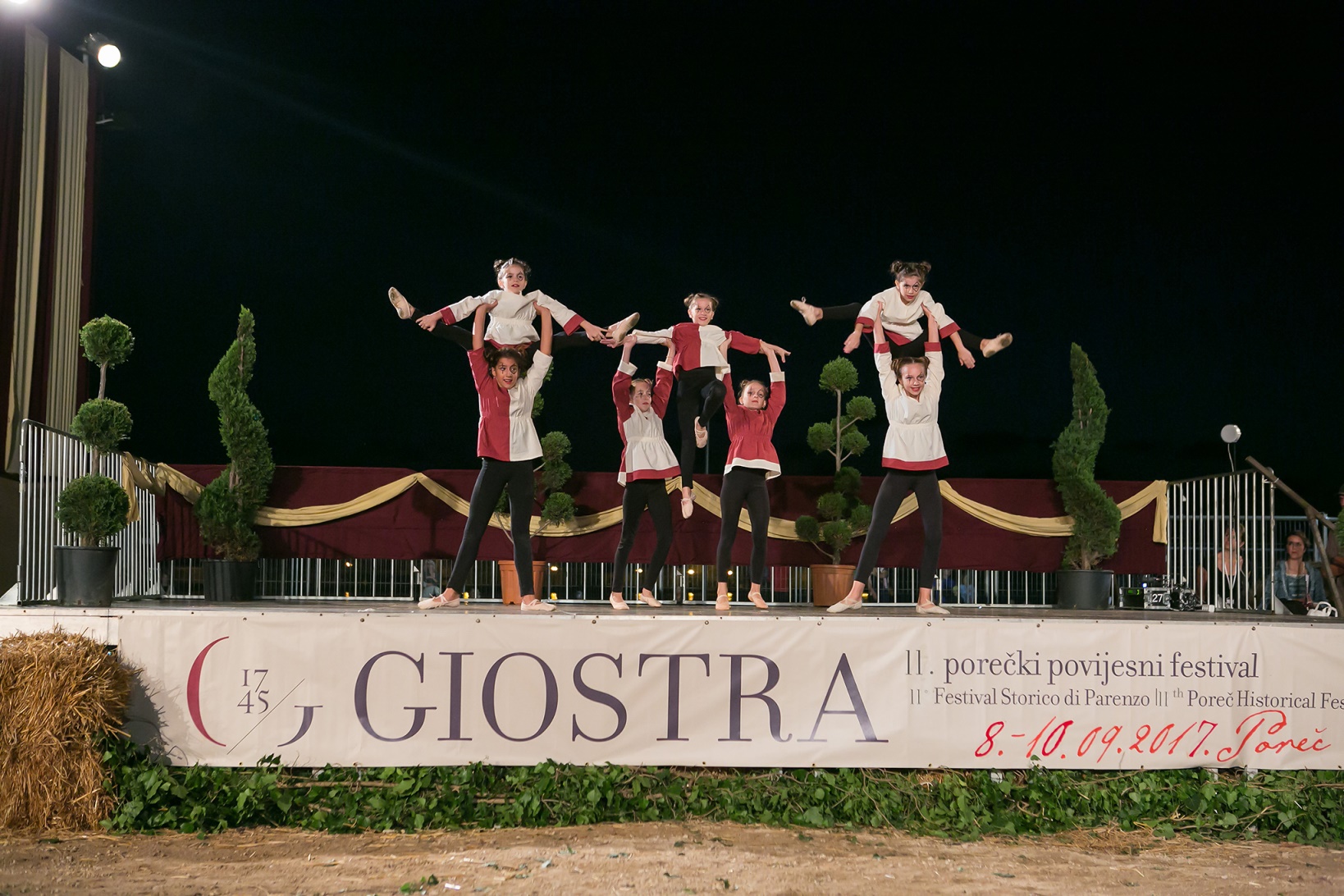 Subotnji jutarnji program nakratko je prekinuo pljusak, ali se plesni, glazbeni i zabavni program nastavlja prema programu. Tijekom nedjelje u prijepodnevnim i poslijepodnevnim satima održat će u kojemu će nastupiti svi festivalski sudionici, pa će se na Trgu slobode moći pogledati plesovi, točke s konjima i druge zabavne točke, nastupat će mačevaoci, dobošari, ulični zabavljači, a bit će organizirano i stručno kostimirano vodstvo po starogradskoj jezgri… Posjetitelji će također moći svjedočiti oživljenoj povijesti baroknih plemićkih i pučkih prostora, a za najmlađe će biti organizirane edukativne radionice i igraonice. Istodobno, posjetitelje Giostre u sklopu svog srednjovjekovnog tematskog parka animirat će i zabavljati članovi Povijesne udruge Kaštel iz Svetvinčenta.