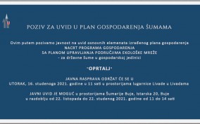 Ovim putem pozivamo javnost na uvid osnovnih elemenata izrađenog plana gospodarenja – NACRT PROGRAMA GOSPODARENJA SA PLANOM UPRAVLJANJA PODRUČJIMA EKOLOŠKE MREŽE – za državne šume u gospodarskoj jedinici “OPRTALJ”.