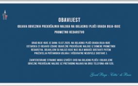 Grad Buje-Buie je dana 13.07.2020. na oglasnoj ploči Grada Buja-Buie (Istarska 2) objavio izdane obavezne prekršajne naloge iz domene prometnog redarstva. Objavljeni su nalozi koje nije bilo moguće dostaviti putem pružatelja poštanskih usluga (višekratne neuspjele dostave).