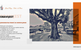 obavještavamo Vas da će se radnim danima u razdoblju od 15.11.2019. do zaključno 04.12.2019. u vremenu od 9,00 do 13,00 sati u pisarnici u Gradskoj upravi Grada Buja (Istarska 2, Buje) zaprimati Zahtjevi za isplatu jednokratne pomoći za umirovljenike s najnižim mirovinama.