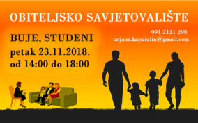 Obavještavamo građane Buja da uslugu Programa obiteljskog savjetovališta tijekom studenog 2018. godine mogu koristiti u petak 23.11.od 14:00 do 18:00 sati uz prethodno ugovoren termin sa provoditeljicom aktivnosti Tatjanom Kapuralin, mob. 091 2121 298; mail adresa: tatjana.kapuralin@gmail.com.