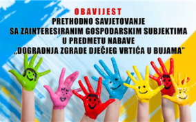 Obavještavaju se zainteresirani gospodarski subjekti da je na stranicama Elektroničkog oglasnika javne nabave - https://eojn.nn.hr/Oglasnik/ objavljeno prethodno savjetovanje sa zainteresiranim gospodarskim subjektima u predmetu nabave „Dogradnja i Rekonstrukcija zgrade dječjeg vrtića u Bujama”.