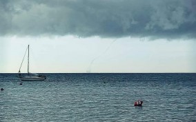 Na fotografiji se vidi tamni oblak koji se nadvio nad mirnim morem, dok se iz središta oblaka prema povr&s