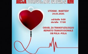 Treća ovogodišnja akcija darivanja krvi organizira se po posebnom protokolu vezanom uz situaciju COVID-19 u utorak 24.03.2020. godine u Općoj bolnici Pula