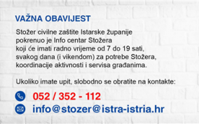 Stožer civilne zaštite Istarske županije pokrenuo je Info centar Stožera koji će imati radno vrijeme od 7 do 19 sati, svakog dana (i vikendom) za potrebe Stožera, koordinacije aktivnosti i servisa građanima.