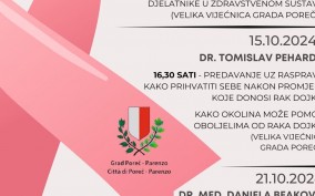 U povodu Mjeseca borbe protiv raka dojke, u utorak, 15. listopada 2024. u 16.30 sati u Velikoj vijećnici Grada Poreča-Parenzo, psihijatar, dr. Tomislav Peharda održat će predavanje i raspravu na temu „Kako prihvatiti sebe nakon promjena koje donosi rak dojke? Kako okolina može pomoći oboljelima od raka dojke?". Predavanje