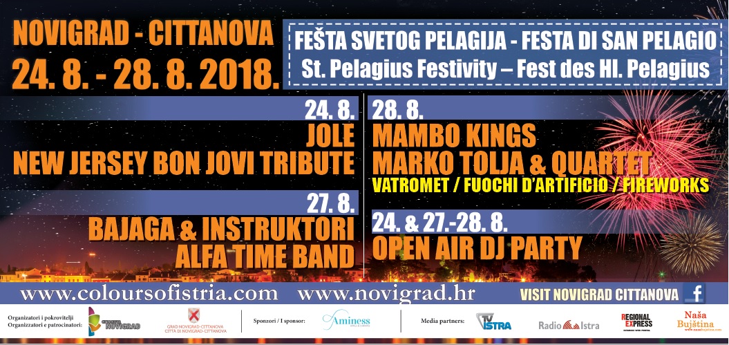 Zbog najave vrlo lošeg vremena za vikend, organizatori novigradske Fešte svetog Pelagija bili su prisiljeni djelomično izmijeniti glazbeni program manifestacije. Kako je i bilo predviđeno, u petak će publiku od 21 sat na pozornici na Porporeli zabavljati Jole, dok će u isto vrijeme na Velikom trgu koncert održati New Jersey Bon Jovi tribute band. U subotu i nedjelju zbog loše vremenske prognoze glazbenog programa neće biti, a najveći dio predviđenih sadržaja prebačen je na ponedjeljak i utorak. U ponedjeljak će na Porporeli od 21 sat koncert održati Bajaga i njegovi Instruktori, dok će na Velikom trgu za one željne fešte i plesa zasvirati Alfa time band. U utorak na Velikom trgu glazbena poslastica uz Marka Tolju, a na Porporeli veselica uz Mambo Kingse. Na trećoj pozornici, onoj u Prolazu Boška Petrovića u subotu i nedjelju također nema koncerata. U petak će – kako je i najavljeno – nastupiti mladi glazbeni talenti iz udruge Mali veliki mikrofon, a u utorak Sergio Pavat i l'Orchestra istriana. DJ party na Porporeli održat će se u petak, te u ponedjeljak i utorak. Vatromet za kraj Fešte predviđen je u utorak u 23 sata.