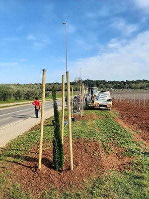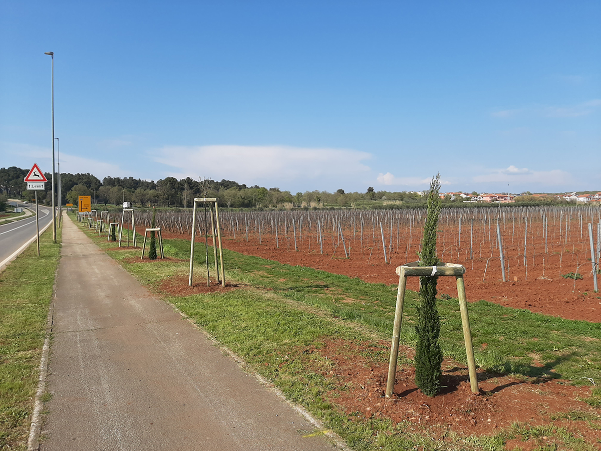 Osim toga, Turistička zajednica se, u suradnji s Gradom odlučila na malo zahtjevniji zahvat - sadnja drvoreda uz pristupne ceste iz smjera Umaga i Poreča. Na lokaciji iz Celege prema Salveli, uz pješačku stazu pored državne ceste Novigrad - Dajla, sadi se pedesetak stabala bagrema i čempresa ukupne dužine 400 metara. Kuglasti bagrem je listopadno stablo kuglaste krošnje, vrlo otporno na štetnike i bolesti, naraste u visinu 5-7 metara i u širinu do 4 m. Izabrali smo tu vrstu zbog toga što stablo stvara ugodnu hladovinu, a ne naraste previše, čime se smanjuje utjecaj na prometnicu. U jesen lišće požuti, a ta boja će se lijepo slagati s tamnozelenom bojom stupolikog čempresa. Stupoliki čempres zimzelena je biljka - četinjača, simbol mediterana. Lišće je aromatično i mirisno, a kao uska, stupolika forma stvara dubinu prostora uz postojeće nasade vinograda u neposrednoj blizini. Uz ovaj drvored, u blizini rotora kod sportske dvorane, sadi se i manji drvored s desetak stabala lipe. Lipa je dugovječno i kvalitetno stablo, idealno za sadnju u urbanim zonama. Cvjeta mirisnim cvjetovima u svibnju i medonosna je biljka.