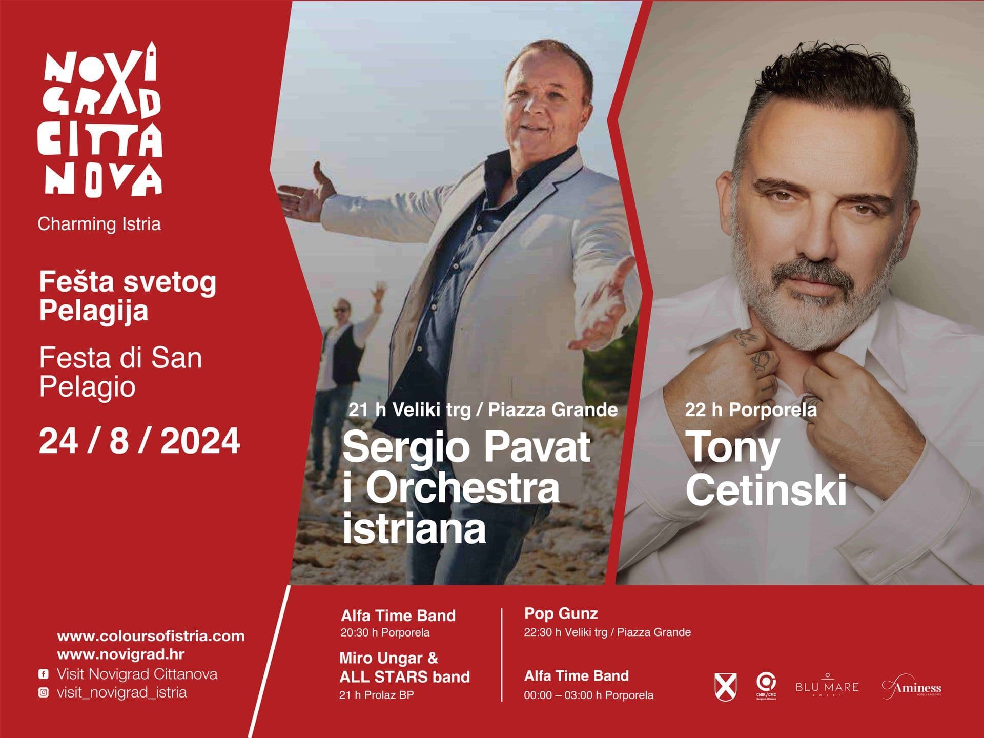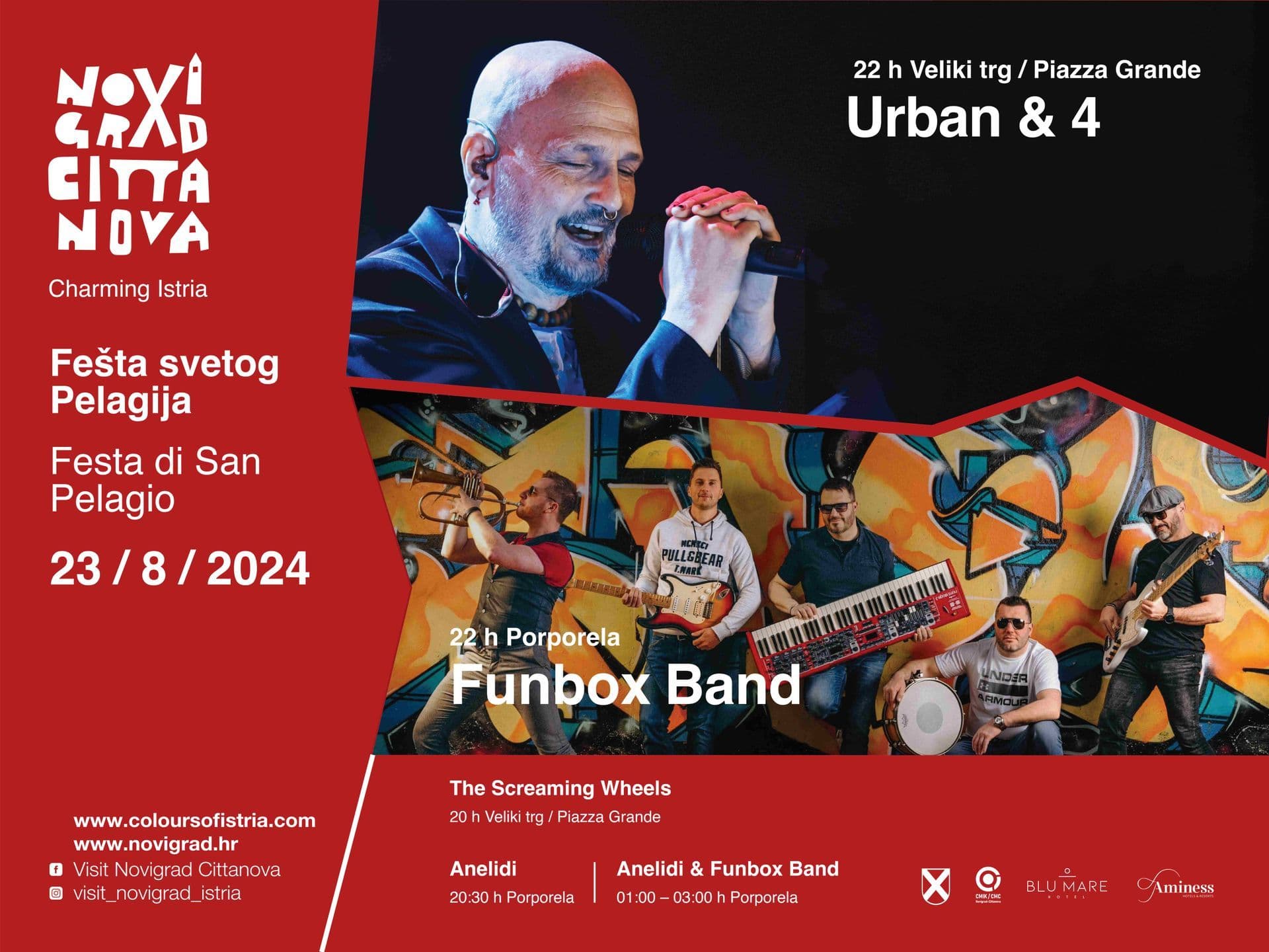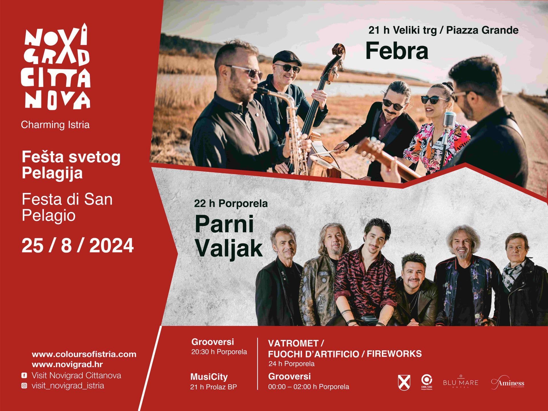 Novigrad redovito ugošćuje zvučna imena hrvatske glazbene scene. Ove godine ćete uživati u nastupu tri sjajna benda. Feštu sv. Pelagija otvaramo s koncertom URBAN & 4 u petak, 23. kolovoza. Koncert će se održati na Velikom trgu s početkom u 22 sata. U subotu, 24. kolovoza, zvijezda večeri bit će TONY CETINSKI. Nastupat će na velikoj pozornici na Porporeli od 22 sata. Glavna zvijezda Fešte sv. Pelagija je PARNI VALJAK koji će u nedjelju, 25. kolovoza, od 22 sata zabavljati goste na Porporeli do ponoćnog vatrometa.
