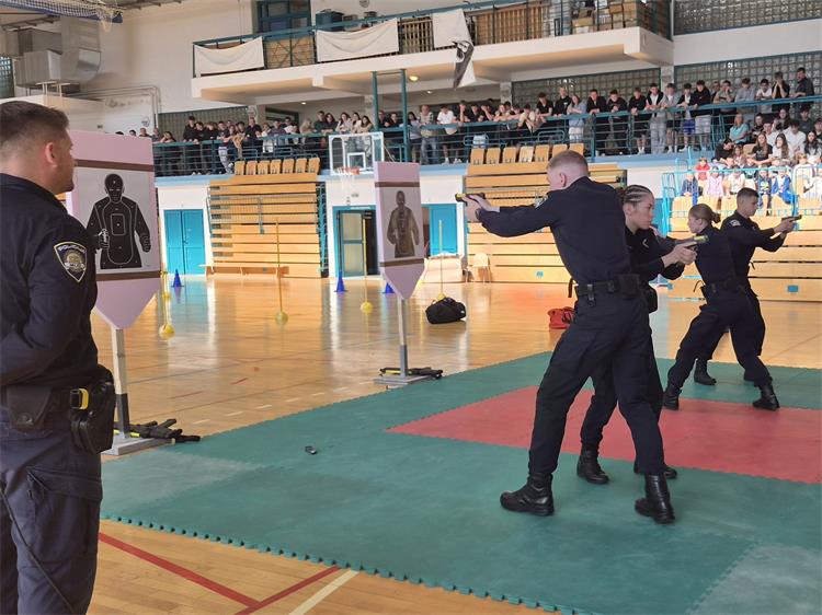 Za zainteresirane građane policija je pripremila zanimljive pokazne vježbe pa je tako policijski demo tim srednjoškolaca koji trenutno pohađaju Policijsku školu ''Josip Jović'' prikazao okupljenima vježbe pravilne uporabe i rukovanja vatrenim oružjem. Budući policajci pokazali su kako sigurno rukuju pištoljem i jurišnom puškom iz različitih pozicija mirovanja i kretanja pa i slučajevima kada se može desiti da im je jedna ruka ozlijeđena.
