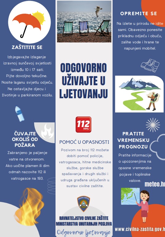 I ove godine Ravnateljstvo civilne zaštite nastavlja s kampanjom „Odgovorno ljetovanje“, koja građanima i posjetiteljima Hrvatske pruža kratke savjete i preporuke za odgovorno ponašanje i izbjegavanje potencijalno opasnih i izvanrednih situacija.