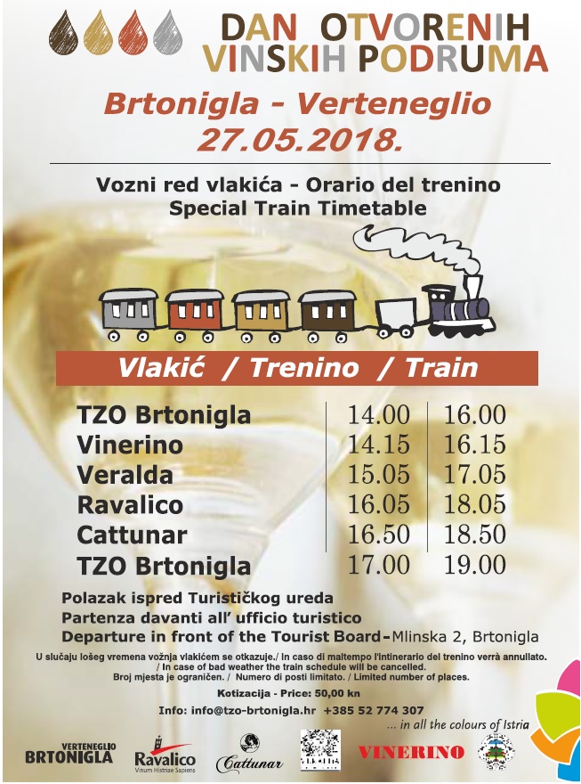 Polazak vlakića predviđen je u dva termina, odnosno prvi u 14h, dok će drugi obilazak podruma krenuti u 16h. Na obilazak podruma kreće se iz Brtonigle, ispred ureda Turističke zajednice te uključuje obilazak ukupno 4 vinarija (Vinerino, Veralda, Cattunar i Ravalico).