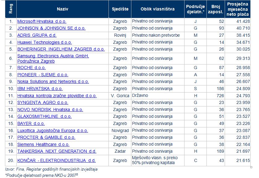 Analiza prosječne mjesečne neto plaće kod 20 poduzetnika s 10 i više zaposlenih s liste 1000 najboljih prema ostvarenom prihodu u 2017. godini, pokazala je da je među njima 18 poduzetnika u privatnom vlasništvu. Od 20 navedenih poduzetnika, 16 je u stranom vlasništvu, a 4 u domaćem (ADRIS GRUPA d.d., Hrvatska kontrola zračne plovidbe d.o.o., TANKERSKA NEXT GENERATION d.d., KONČAR-ELEKTROINDUSTRIJA d.d.) Među tim poduzetnicima, najveća prosječna mjesečna neto plaća obračunana je zaposlenima u društvu Microsoft Hrvatska d.o.o.