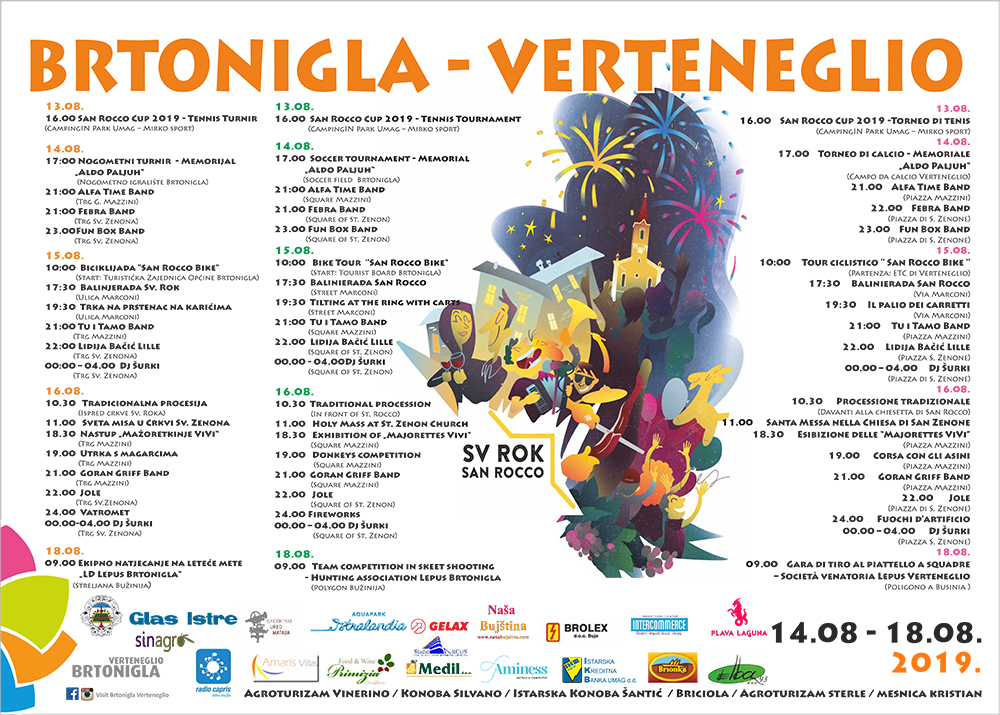U utorak 13. kolovoza započinje se u sportskom duhu uz teniski turnir San Rocco Cup 2019, te se nastavlja sljedećeg dana uz nogometni turnir – Memorijal „Aldo Paljuh“ nakon kojeg kreće večernja zabava na dva trga uz Alfa Time Band, Febra Band i Fun Box Band. Tog dana, 14. kolovoza ulice Brtonigle bit će ispunjene raznim štandovima na kojima će se moći uživati u raznolikoj enogastronomskoj ponudi. No, bit će i manjih štandova sa raznim rukotvorinama i lokalnim autohtonim proizvodima. Bogata ponuda bit će prisutna do posljednjeg dana manifestacije.