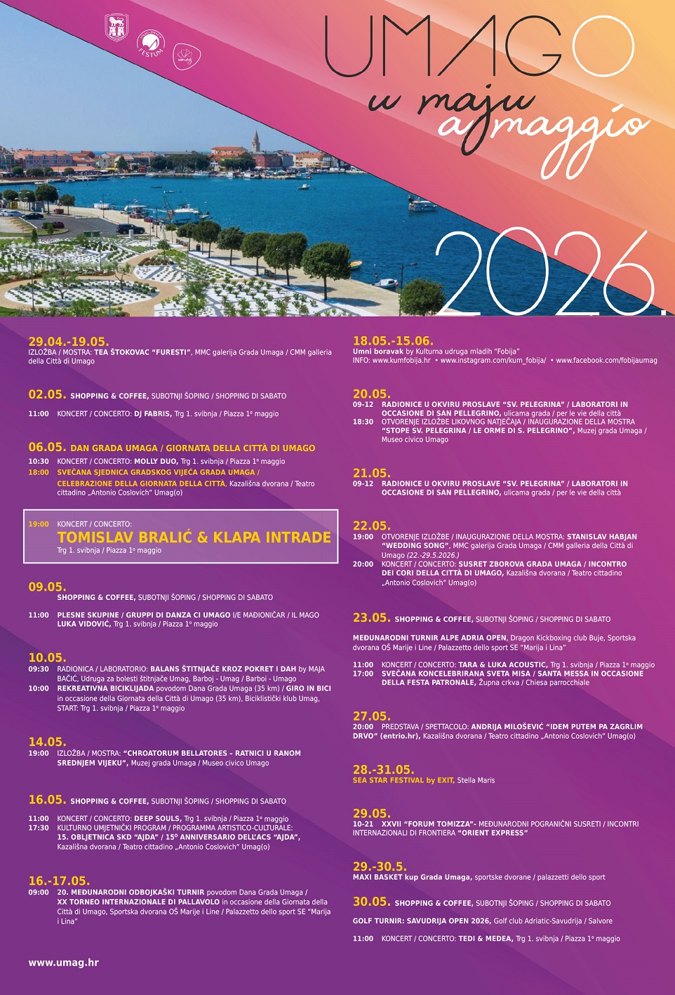 23.04.2026.Stigao nam je još jedan svibanj u Umag, a svi već znaju kako upravo svibanj nosi niz događaja za sve ukuse i generacije, a koji predstavljaju najbolju uvertiru u dinamičan i bogat ljetni program. Grad Umag već dugi godinama na simboličan način obilježava „svoj“ mjesec, i to manifestacijom „Umag u maju“ koja se prije desetak godina vratila u naš prekrasan grad, nudeći mnoštvo kulturno-zabavnih evenata. Ova je svibanjska manifestacija inspirirana nekadašnjom tradicionalnom „feštom“ koja se odvijala u Umagu te okupljala brojne građane i turiste. Grad Umag, Ustanova Festum, Turistička zajednica grada Umaga, umaške ustanove i udruge te mnogi drugi suorganizatori, potrudili su se da mjesec Grada Umaga i njegovog zaštitnika, svetog Pelegrina, ponudi široku paletu raznovrsnih evenata svojim sugrađankama i sugrađanima.