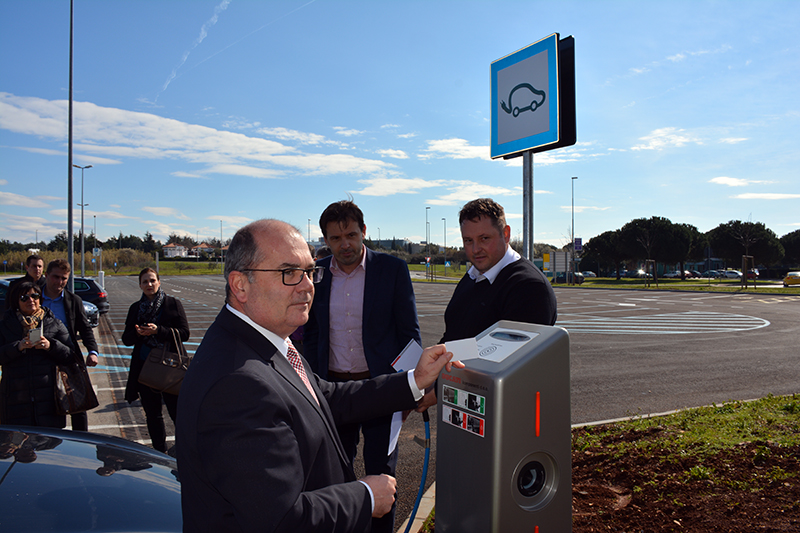 Punionicu je umetanjem magnetske (tzv. RFID) kartice za punjenje vozila prvi pustio u rad direktor FZOEU-a Sven Müller, koji se potom, zajedno s gradonačelnikom Grada Novigrada-Cittanova Anteom Milosom, kratko provozao parkiralištem netom napunjenim električnim vozilom Tesla S, kojeg je za ovu prigodu priskrbio dobavljač punionice, tvrtka Ducati komponenti.