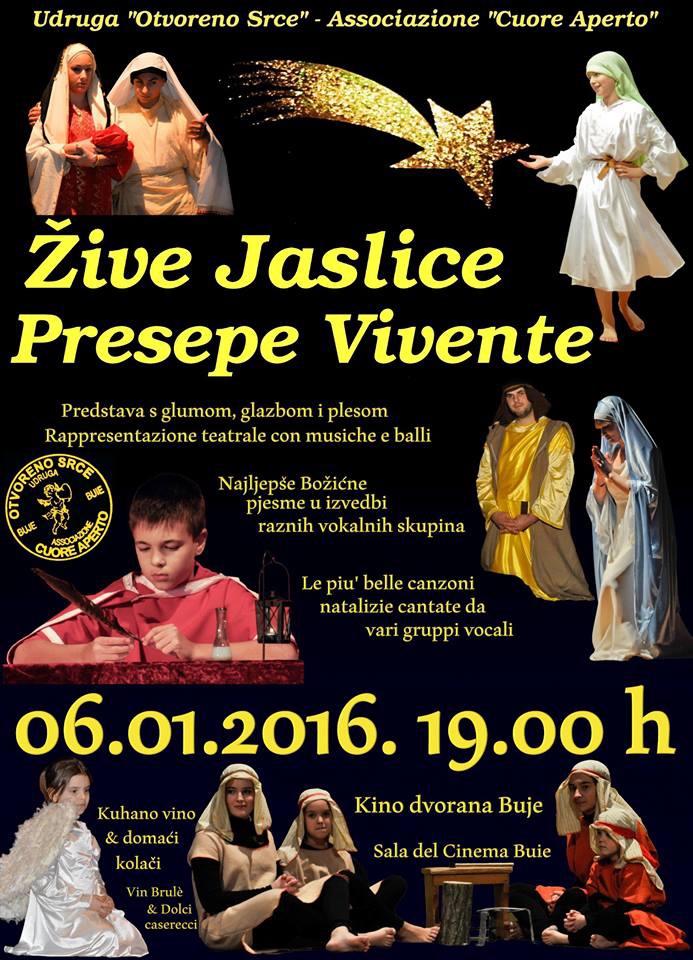 I ove godine udruga "Otvoreno Srce" priprema predstavu "Žive jaslice" sa pjesmama, plesom i glumom uživo koju će izvesti mladi sa Bujštine. Na kraju predstave, najljepše Božićne pjesme otpjevati će Dante i Anita, vokalna skupina "Armonia" iz ZT Vižinada, Klapa Rožice, Evegreen ZT Momjan, uz iznenađenje kaubojske grupe iz ZT Kaštel, pod vodstvom Ivane Kozlevac koji će otplesati country ples. Ne propustite!! 06.01.2016. na blagdan Sveta Tri Kralja, ŽIVE JASLICE u kino dvorani POU-a Buje, s početkom u 19.00 sati. Organizatori će svoju publiku počastiti odličnim kuhanim vinom i ukusnim domaćim kolačima.