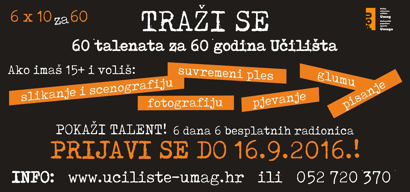 Umag, 7. rujna 2016. Projekt 6x10za60 osmišljen je kako bi obilježili 60. obljetnicu Pučkog otvorenog učilišta “Ante Babić” Umag i obuhvaća 6 šestodnevnih radionica po 10 polaznika, vođenih od vrhunskih predavača i poznatih mentora.