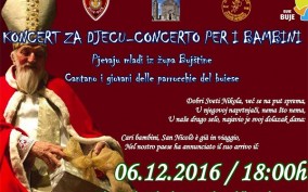 Povodom blagdana sv. Nikole, 06.12.2016. pozivamo Vas na doček sv. Nikole koji će blagosloviti i darovima iznenađenja obradovati djecu uz prigodni koncert u crkvi Majke Milosrđa na kojem će nastupiti mladi iz župa Bujštine, s početkom u 18.00 sati.