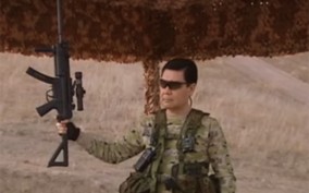 Bivši zubar Gurbangulu Berdimukhamedov izgleda kao komandos sa crnim naočalama i ogromnom automatskom puškom. On baca noževe i raznosi čitave baze, dok mu zadivljene kolege plešću. Poanta ovog performansa, kažu iz Berdimukhamedove vlade, bila je da se demonstrira predsjednikova "vrhunska vojna obuka" i